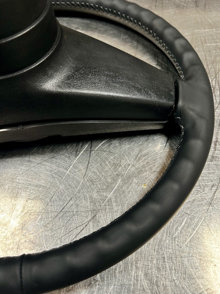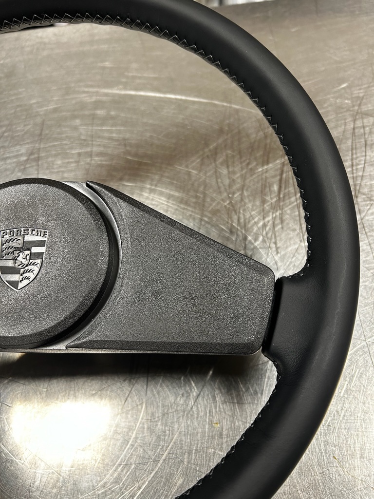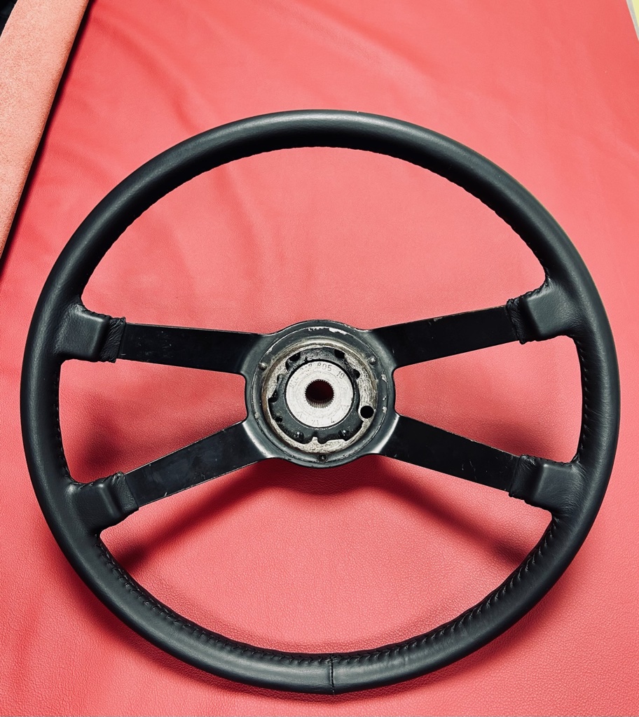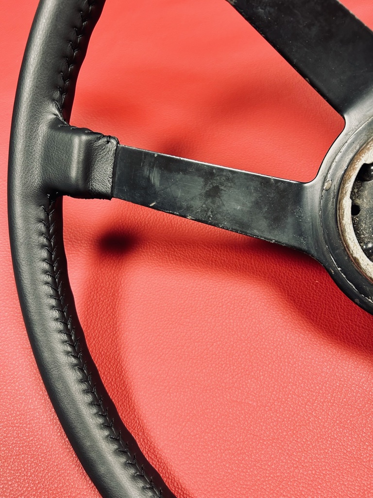 Confection sur mesure d’une coiffe en cuir pour le volant d’une PORSCHE 914
