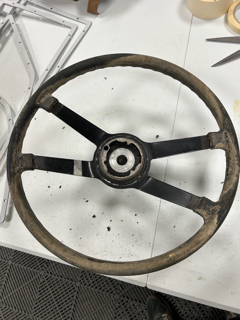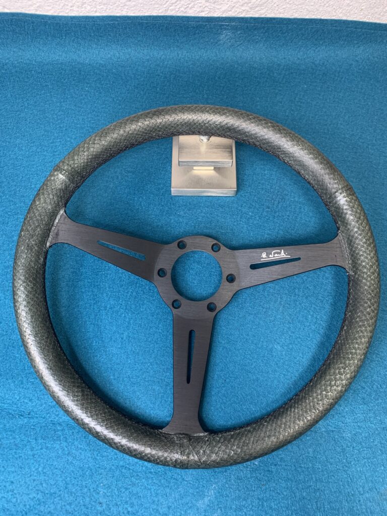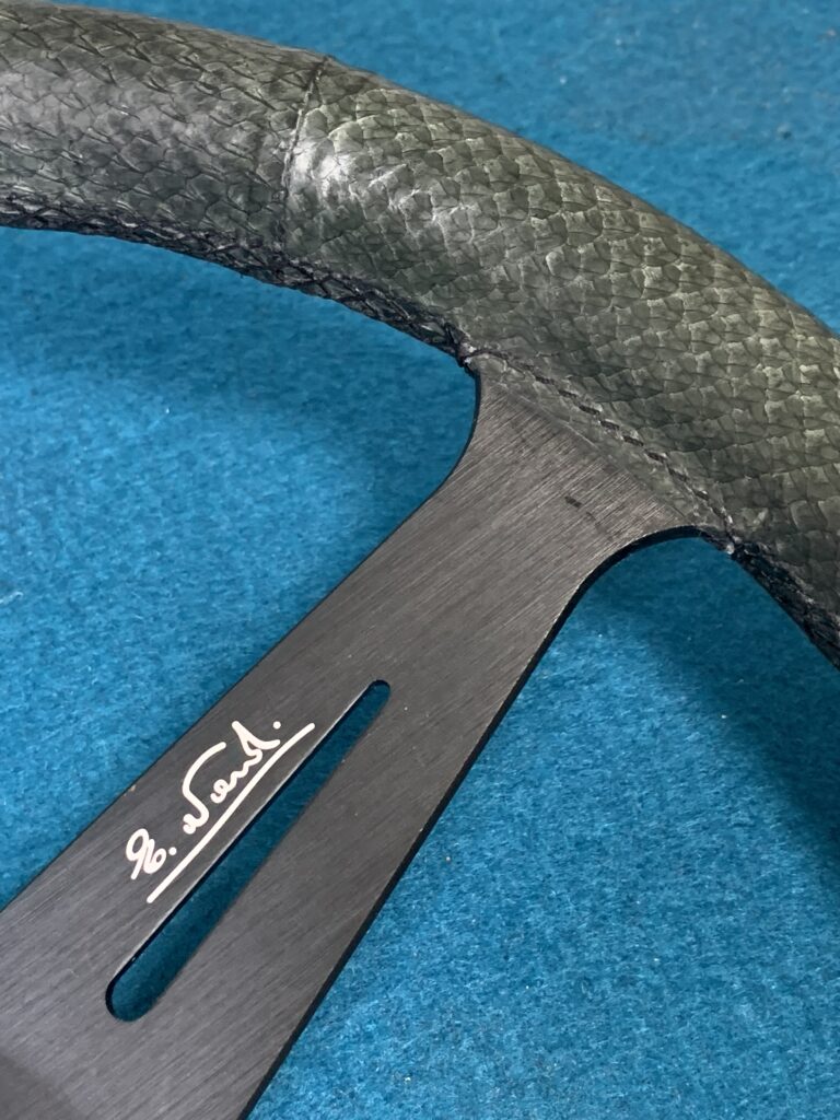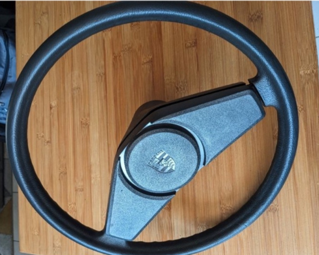 Confection sur mesure d’une coiffe en cuir pour le volant d’une PORSCHE 914
