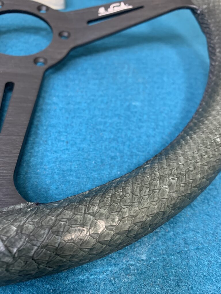 Confection sur mesure d’une coiffe en cuir de saumon pour un volant Nardi